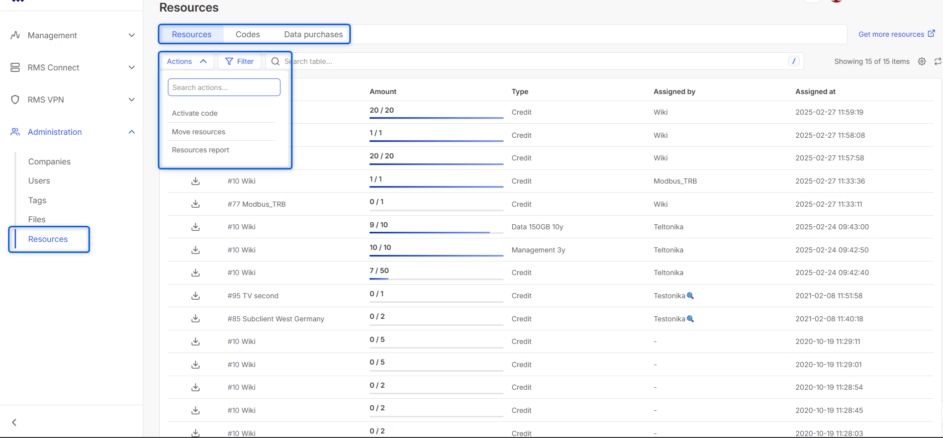 A new page under Administration has been added for more centralized RMS resource control and monitoring. Here, you will be able to see all resource pools that were assigned to your RMS company or any of your sub-companies, download each resource pool report to see how they were used, view created resource codes and how they were used, view company data conversion history.