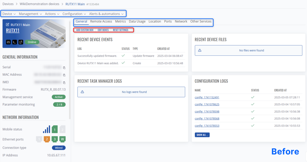 Custom boxes for displaying custom parameters in the Device Details menu were removed. Instead users are able to use the Dashboards functionality to display various parameters collected on RMS in customizable widgets.
