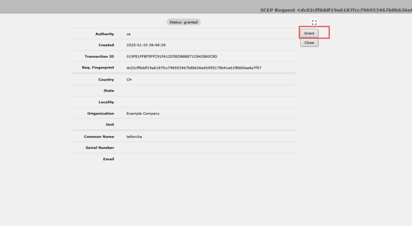 After the enrollment is triggered from the Teltonika Router the SCEP server also needs to grant an access.