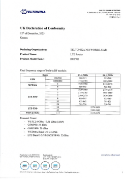 | [[File:RUT901 UK DoC v2.0-1.jpg|thumb|left|250px|link=Special:Redirect/file/RUT901 UK DoC v2.0-1.jpg|UK Declaration of Conformity, page 1]] | |||
