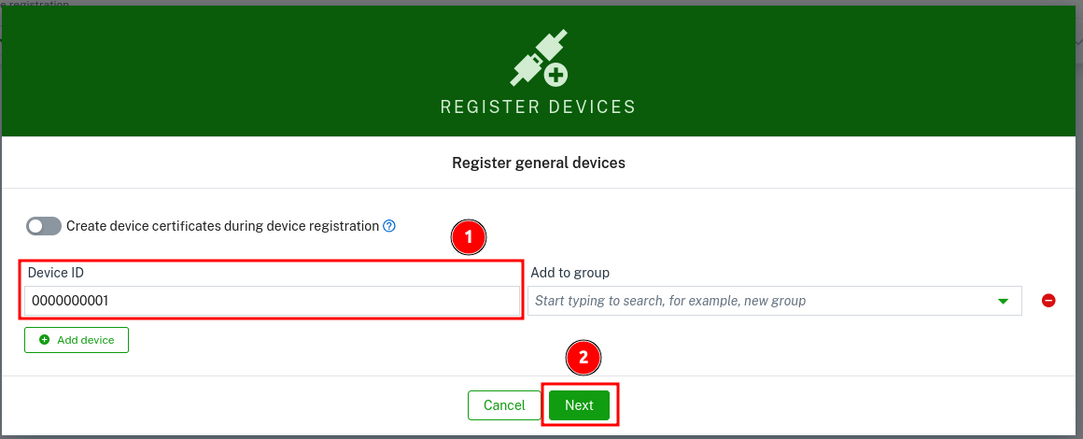 <li>Click '''<nowiki/>'Next'<nowiki/>'''.[[File:Cumulocity iot Device registration step 1.png|1083x1083px]] | |||
