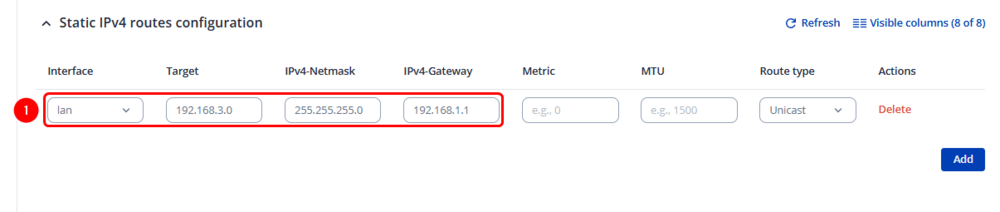 #Select Interface: '''lan''' | Enter Target: '''192.168.3.0''' | Enter IPv4-Netmask: '''255.255.255.0''' | Enter IPv4-Gateway: '''192.168.1.1''' | |||