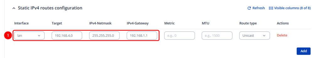 #Select Interface: '''lan''' | Enter Target: '''192.168.4.0''' | Enter IPv4-Netmask: '''255.255.255.0''' | Enter IPv4-Gateway: '''192.168.1.1''' | |||