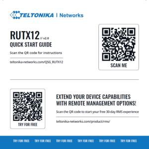 | colspan="2" style="width: 908px; text-align: left; background: white;" |Starting in May 2025, RUTX12 devices will include an updated Quick Start Guide (QSG) flyer in the packaging. This new flyer features multiple languages—English, German, Spanish, French, and Italian—along with a condensed version of the QSG and a QR code/link to the full web version at [https://teltonika-networks.com/QSG_RUTX12 teltonika-networks.com/QSG_RUTX12] | |||
