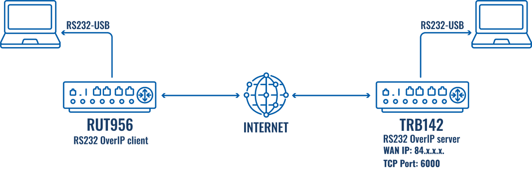 This article provides a configuration example to enable communication from a serial device connected to the TRB142/5 to another serial device (e.g. RUT955/6) using OverIP via public IP or RMS VPN.