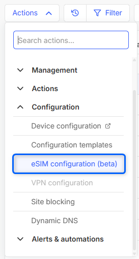 - 07:47, 28 August 2025 JustasB talk contribs created page How to configure eSIM profiles in RMS? (Created page with "==eSIM configuration== The eSIM configuration allows you to set up an eSIM profile on eSIM compatible devices. To configure your devices, navigate to the RMS web page, open the left sidebar panel, go to ('''Management → Devices''') and select the device(s). Then, click on border and then <b>Configuration</b> submenu, there you will find '''eSIM configuration'''. border|200px [[File:Rms esim1.png|border|200px]...")