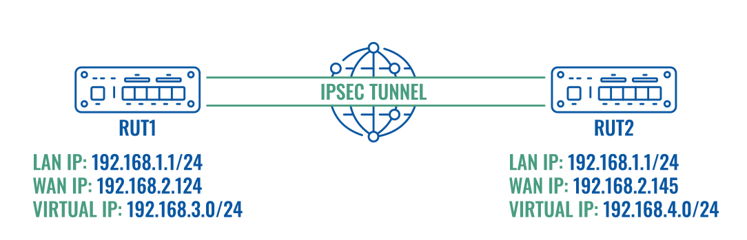 First of, lets configure a simple connection between two IPsec instances, i.e., RUT1 and RUT2.