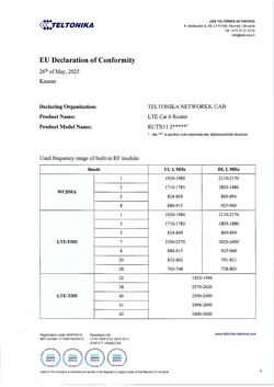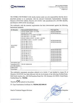 | EN 55032:2015 + A11:2020 + A1:2020 EN 55035:2017 + A11:2020 EN IEC 61000-3-2:2019 + A1:2021 + A2:2024 EN 61000-3-3:2013 + A1:2019 + A2:2021 EN 301 489-1 V2.2.3 EN 301 489-3 V2.3.2 EN 301 489-17 V3.3.1 EN 301 489-19 V2.2.1 EN 301 489-52 V1.2.1 |