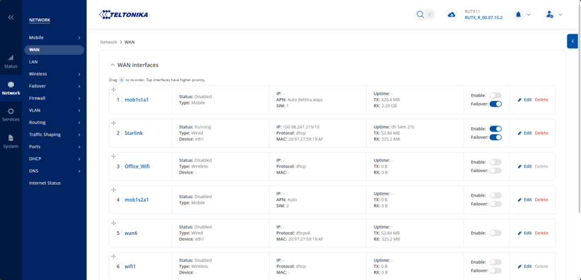 This article provides a guide on how to use starlink connection and setup failover configuration using RUTX11. These configurations can be implemented on RUT, RUTX and TRB series devices.
