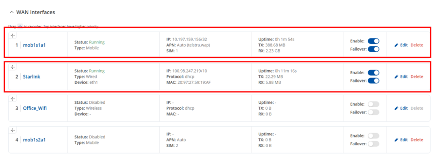 If you want Starlink to be your primary connection, make sure the WAN interface is at the top of the list in Network → Interfaces → General.