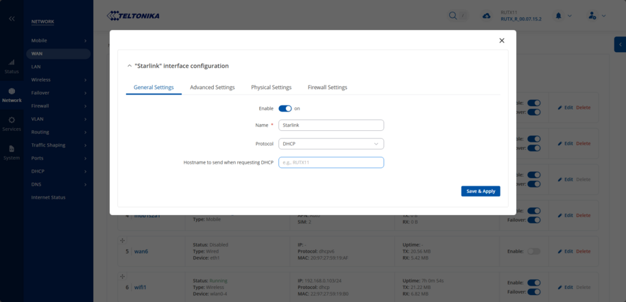 This article provides a comprehensive configuration example, detailing how to establish a Starlink connection with a Teltonika router, as well as how to set up Starlink failover.