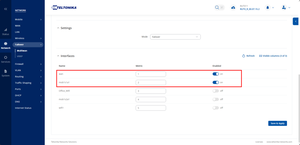 Firstly, In the WebUI, navigate to Network → Failover →Multiwan. In this section, you should observe two entries: " WAN," which represents your starlink connection, and "mob1s1a1", which corresponds to your Teltonika Networks router. Both of these entries should be indicated as online. Next arrange the connection order by simply changing the Metric value of "WAN" to "1" and "mob1s1a1" to "2". This sequence determines the order of priority for the connections.