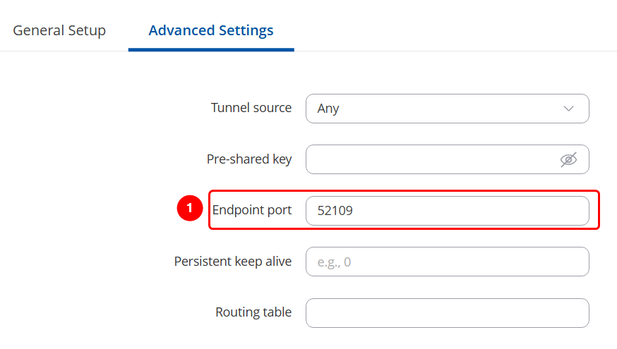 - Head to the Advanced Settings tab, and add the Endpoint Host port, also taken from the generated WireGuard configuration file. In our case, it is 52109