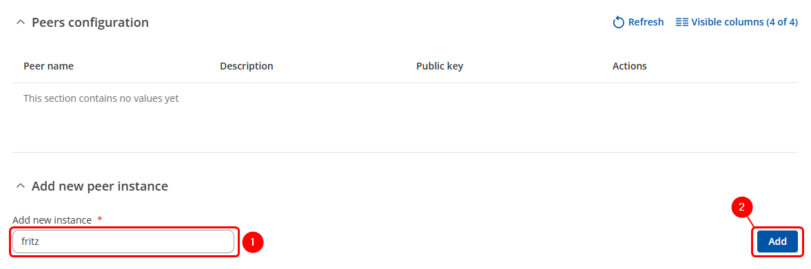 - Now we'll create a peer (FritzBox) connection so the tunnel can be established.