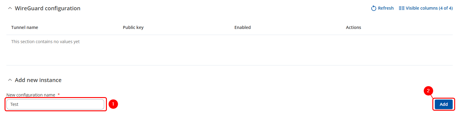 - Add a new WireGuard instance by entering custom New configuration name and clicking Add button.
