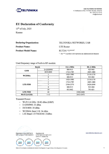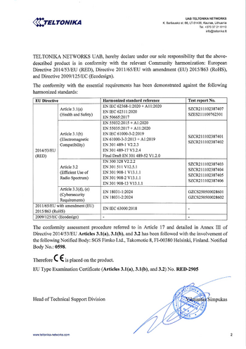 | EN 55032:2015+A11:2020+A1:2020 EN 55035:2017+A11:2020 EN 61000-3-3:2013+A1:2019+A2:2021 EN IEC 61000-3-2: 2019+A1:2021+A2:2024 EN 301 489-1 V2.2.3 EN 301 489-17 V3.3.1 EN 301 489-52 V1.3.1 |