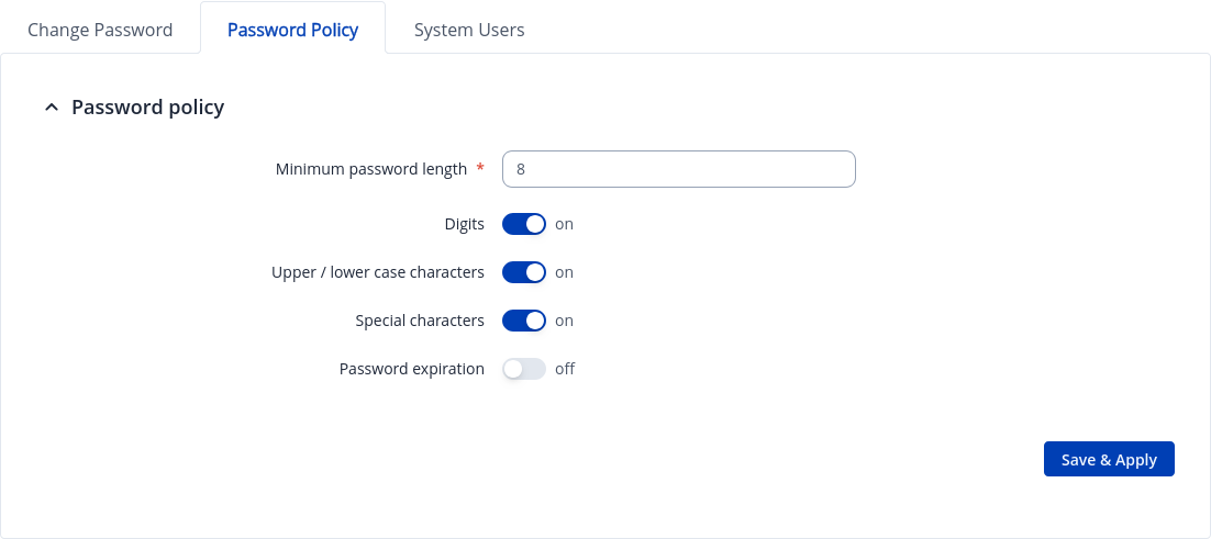 | Upper / lower case characters | off | on; default: on | Password must contain at least one upper and lower case letter (A-Z, a-z). |