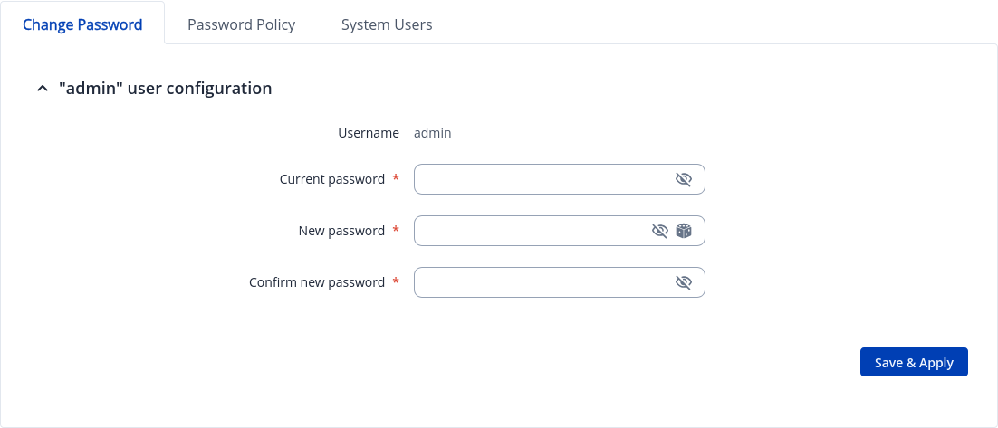 The Users section lists all created users and provides the possibility to change their passwords and the group they belong to (with the exception of the default user "admin" which always belongs to the root group).