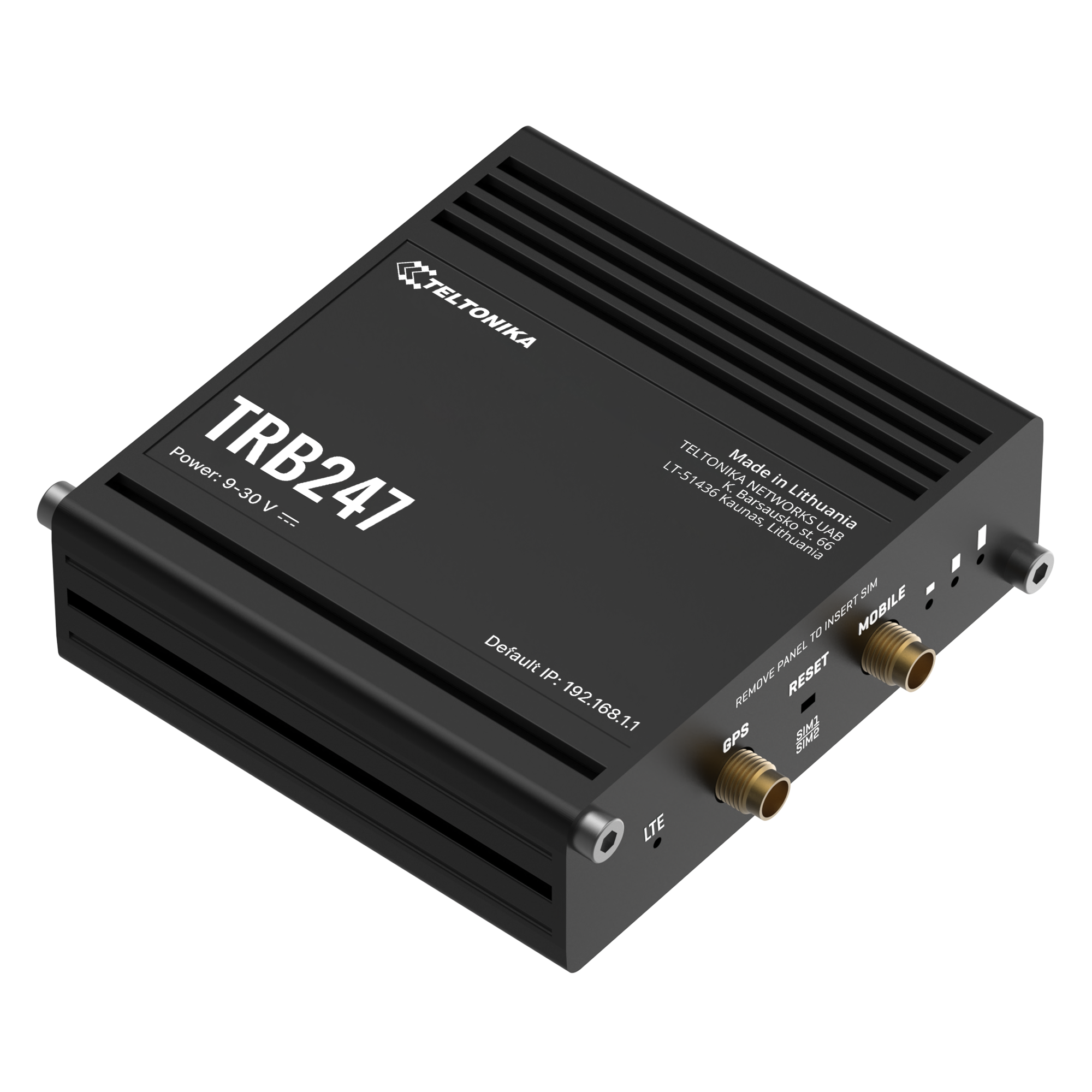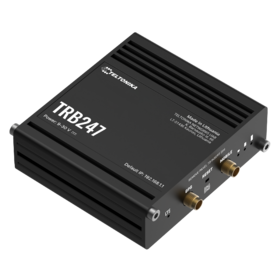 TRB247 is a compact industrial 4G (LTE) gateway equipped with an Ethernet port, a connector block which includes pins for I/O, RS232, RS485, GPS and RutOS software for advanced networking solutions.