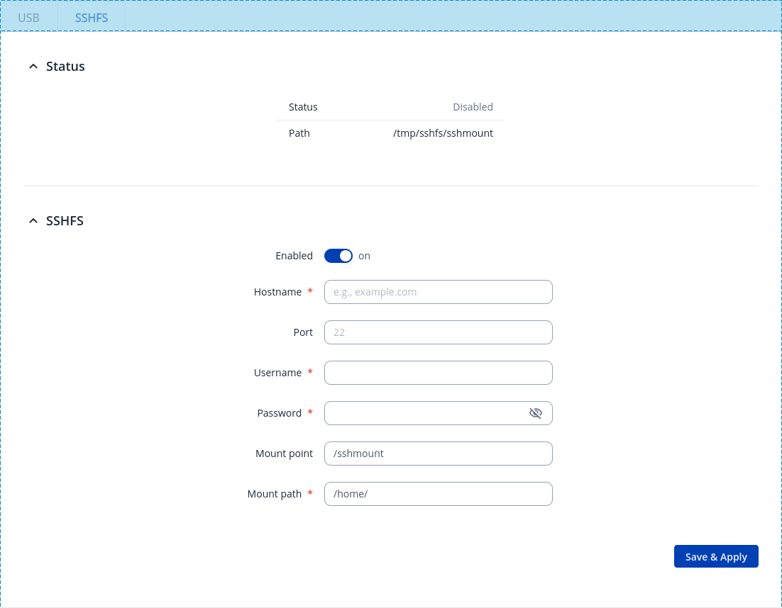 SSHFS configuration consists of setting up authentication, port and mount information parameters. Below is an example oh the SSHFS configuration page.