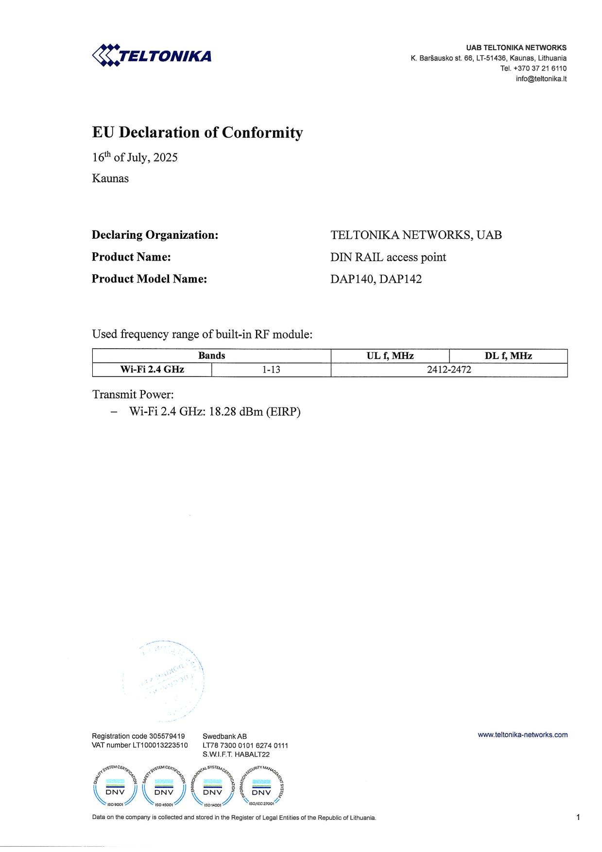 | EN 55032:2015 + A11:2020 + A1:2020 EN 55035:2017 + A11:2020 EN 301 489-1 V2.2.3 EN 301 489-17 V3.2.4 |