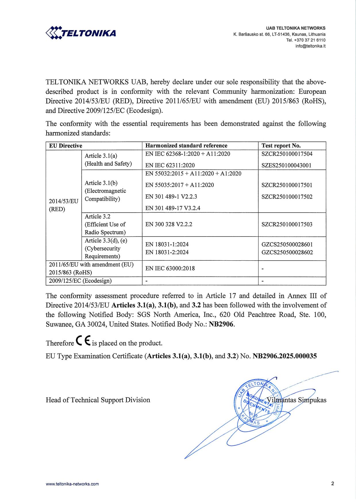 EU Type Examination Certificate (Articles 3.1(a), 3.1(b), and 3.2) No.: NB2906.2025.000035