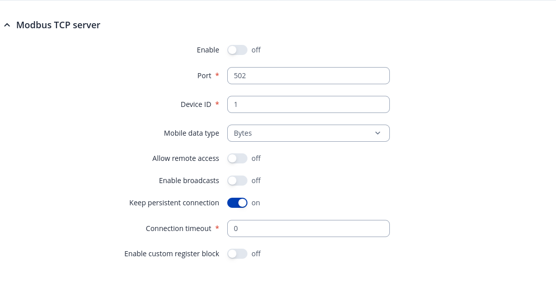 | Keep persistent connection | off | on; default: onn | Allows keep the connection open after responding a Modbus TCP client request. |