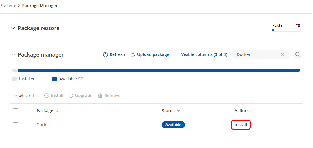 Firstly, we will need to download the Docker package from the Package Manager. Login to the WebUI of your router, navigate to System → Package Manager: