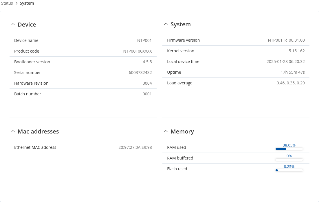 Main Page > NTP Servers > NTP001 > NTP001 Manual > NTP001 WebUI > NTP001 Status section > NTP001 System