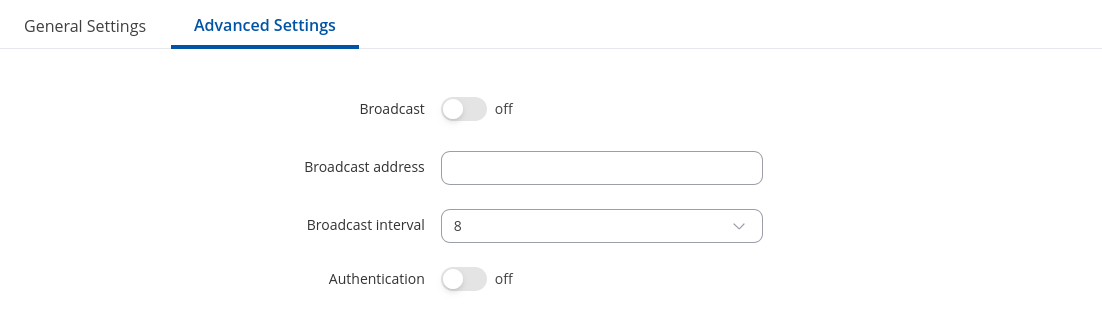 | Broadcast interval | 8 | 16 | 32 | 64 ......| 2048; default: 8 | Broadcast interval in seconds. |
