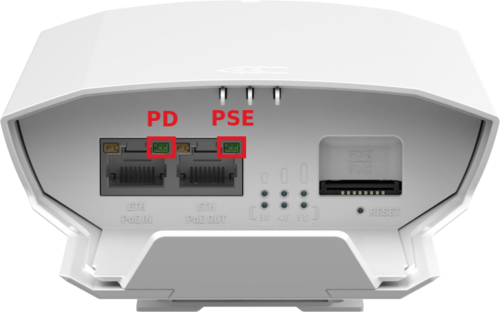 The power LED's are located on the each Ethernet ports (POE In/POE Out). Green PD (Power Device) LED shines when power is supplied to device PoE In port. Green PSE (Power Sourcing Equipment) activity LED shines when PD device is connected to PoE Out port.