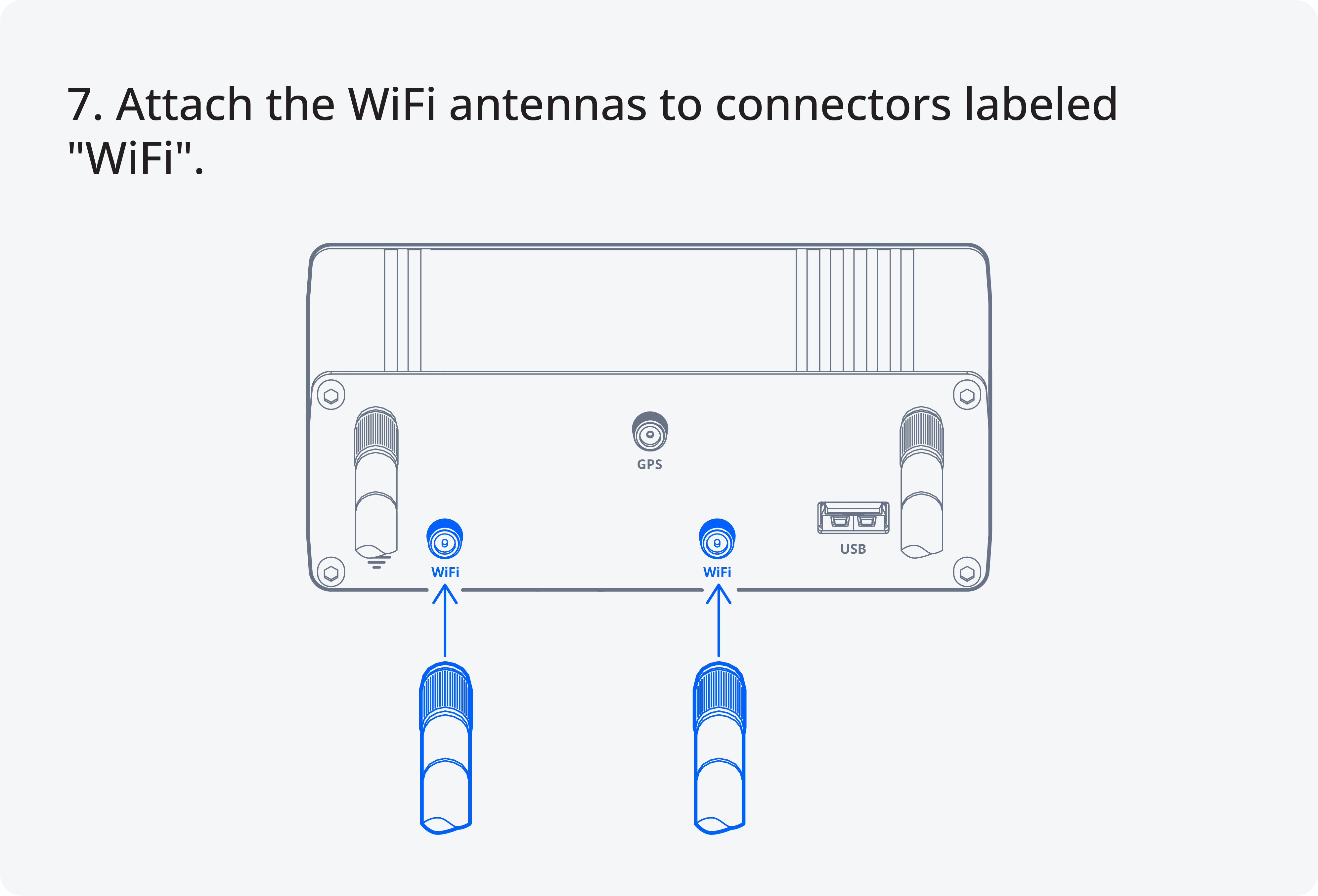 | WiFi antenna | 2400~2500/5100~5950 MHz, 50 Ω, VSWR < 2.5, Gain 3.59 dBi, Omnidirectional, RP-SMA Male connector |