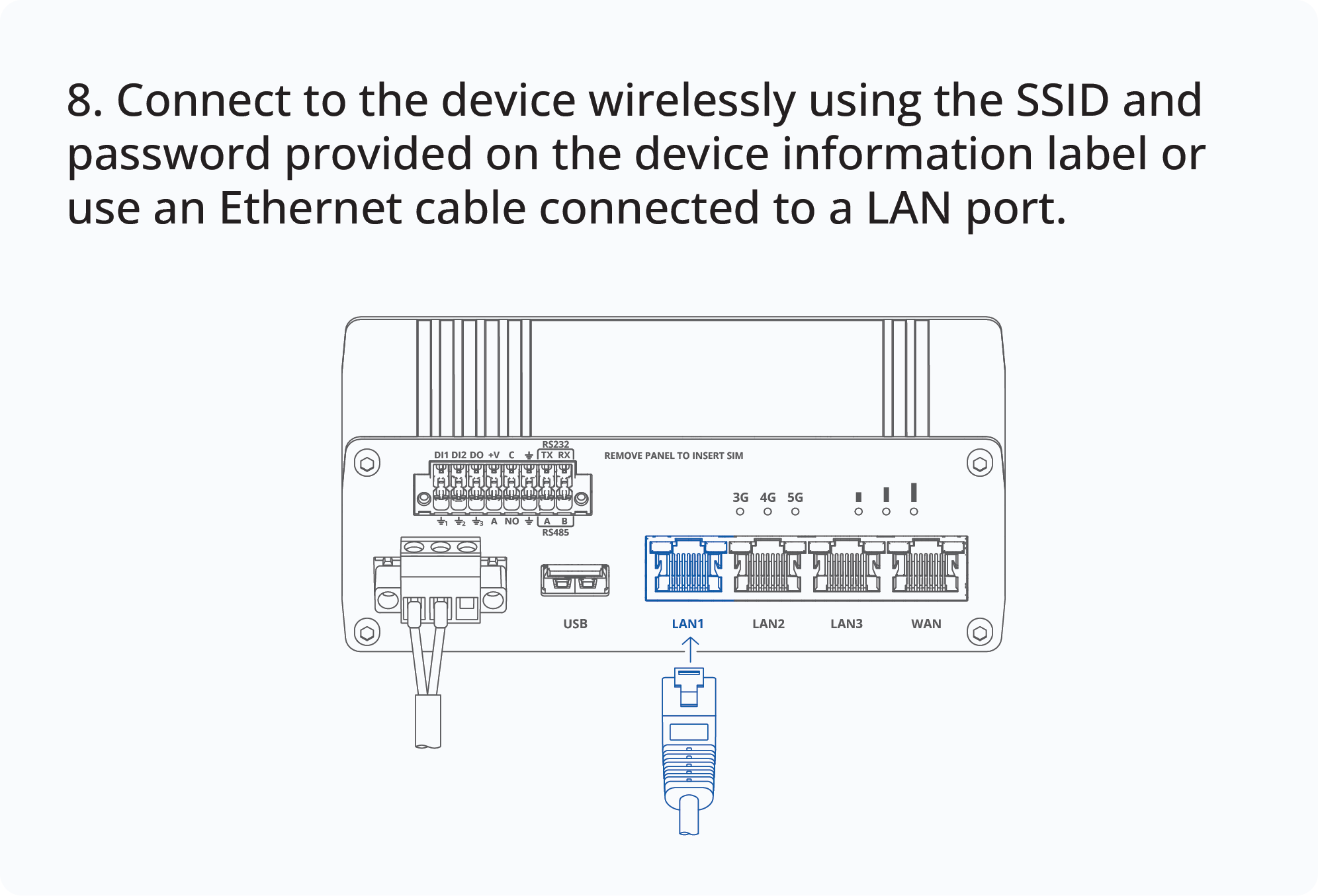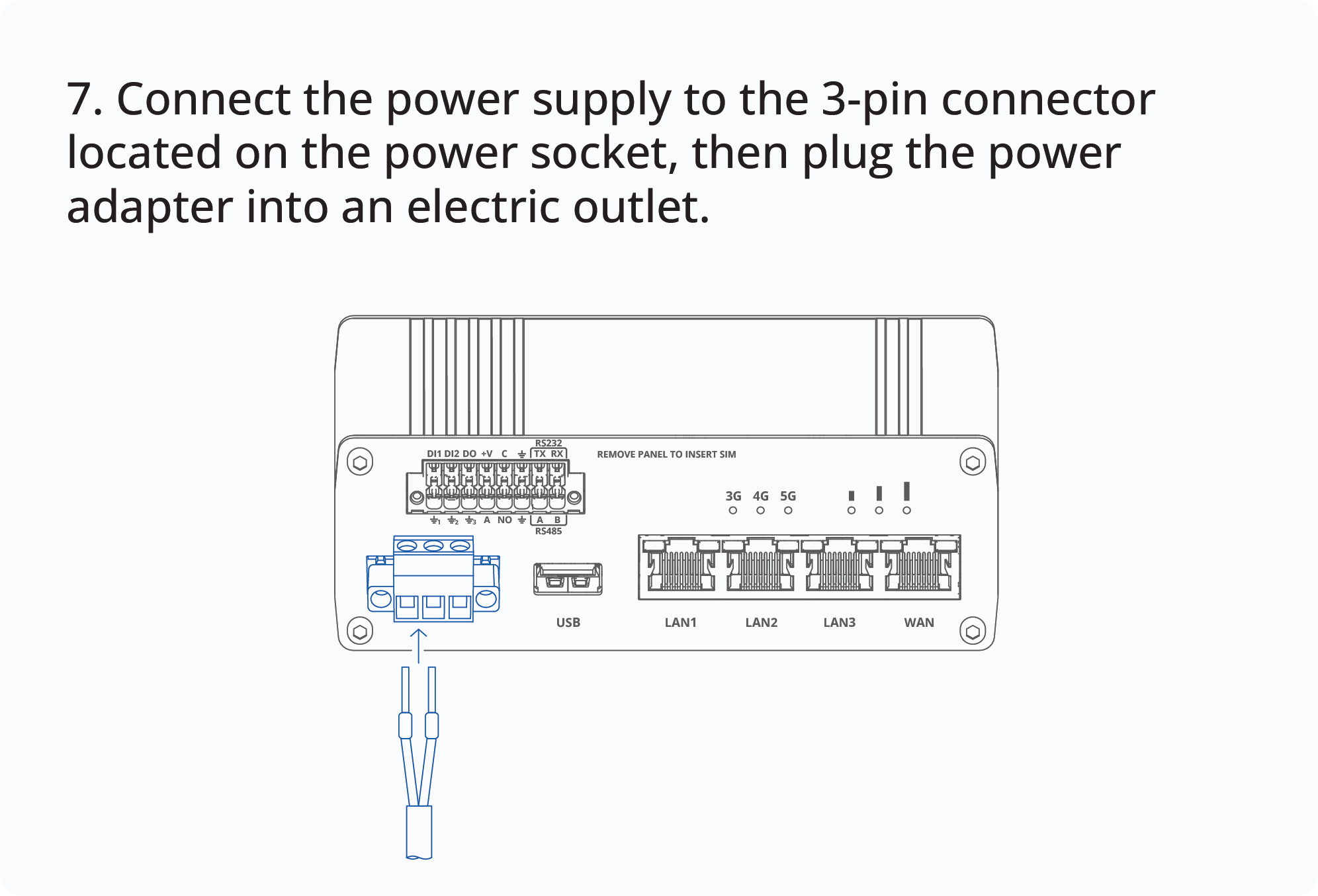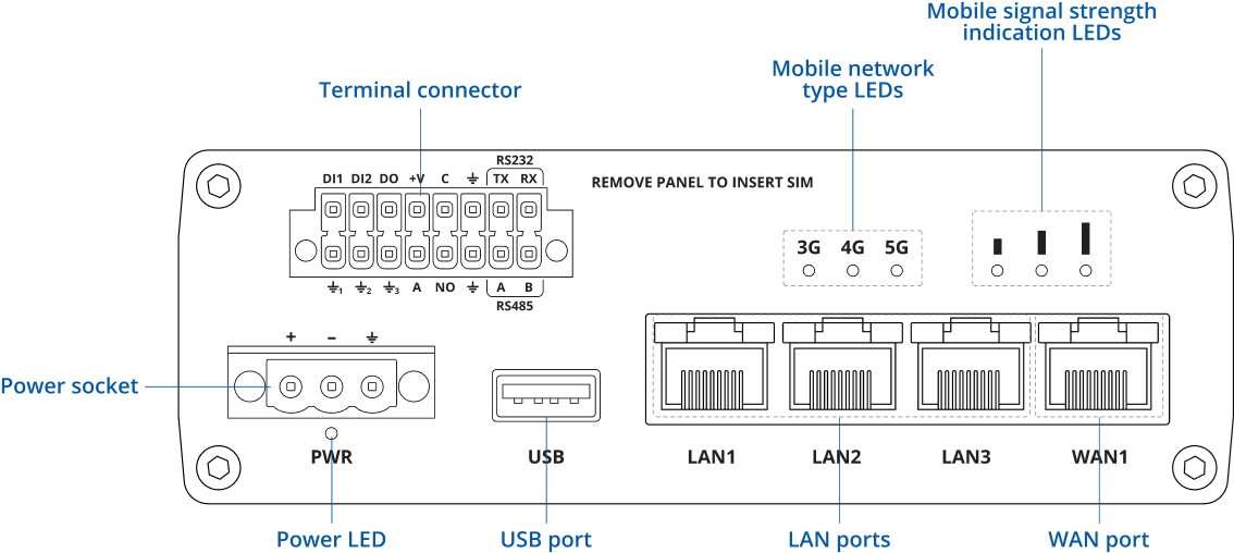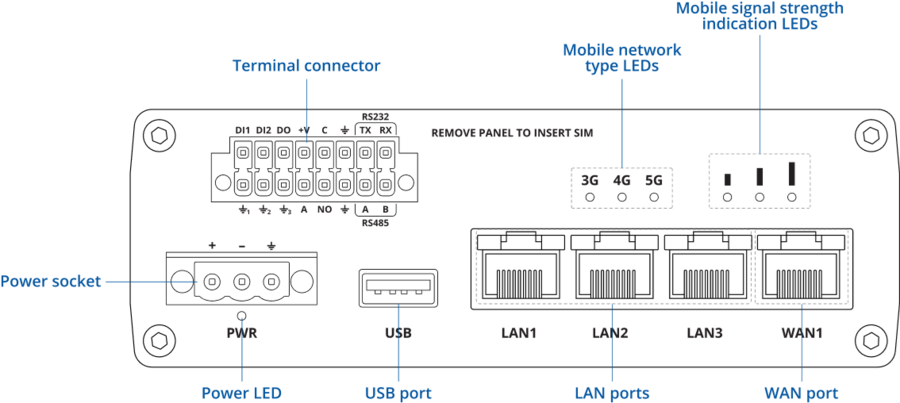 This Wiki page contains the online version of the Quick Start Guide (QSG) for the RUTM55 5G Router. Here you will find an overview of the various components on the front and back of a RUTM55 device, hardware installation instructions, first login information, device specifications, and general safety information. It is highly recommended to acquaint yourself with the Quick Start Guide before using the device. You can also locate a printed version of the Quick Start Guide in the packaging box of your device.