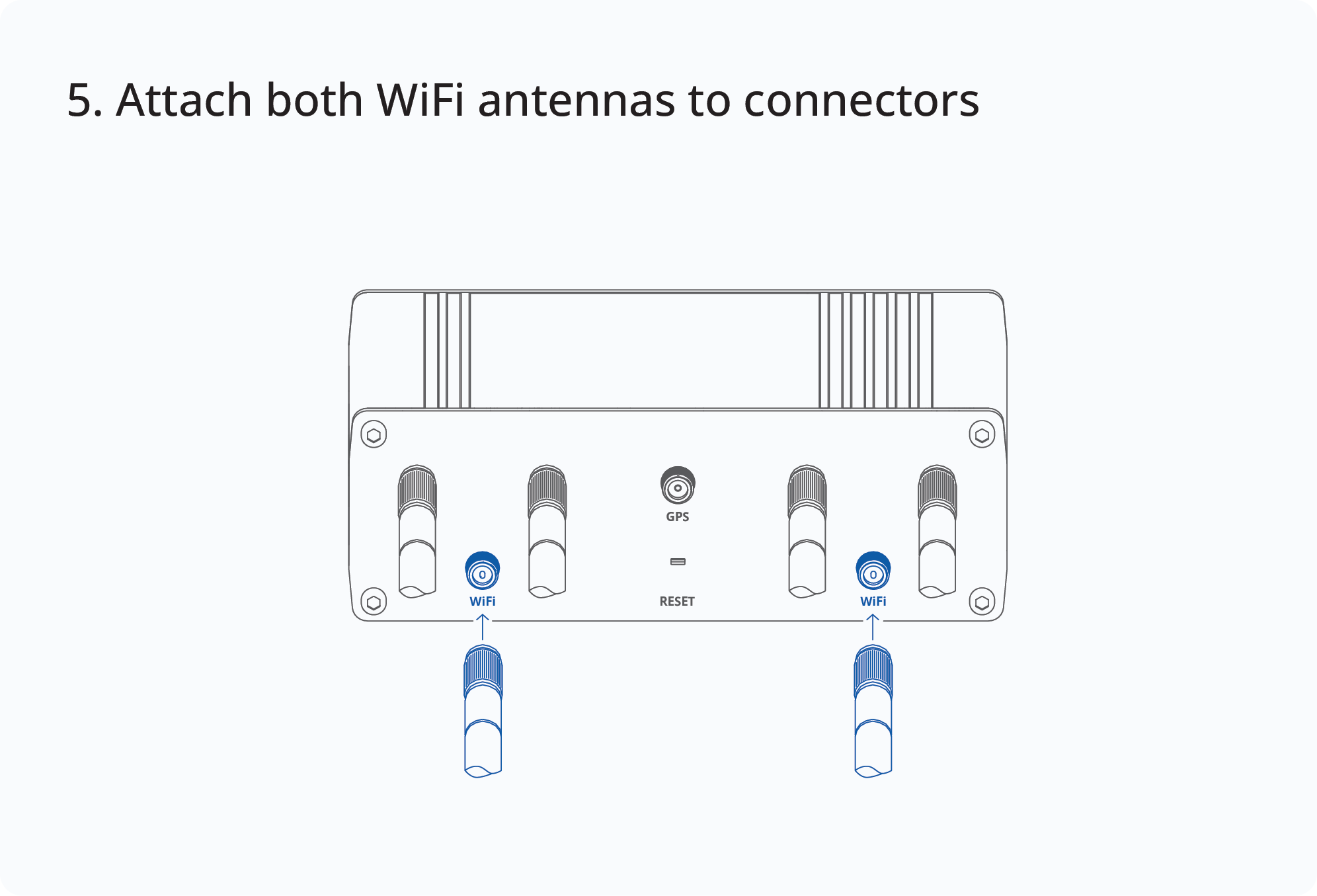 | Wi-Fi antenna | 2400~2500 MHz / 4950~5850 MHz, 50 Ω, VSWR<=2, gain** 3 dBi, omnidirectional, RP-SMA male connector |