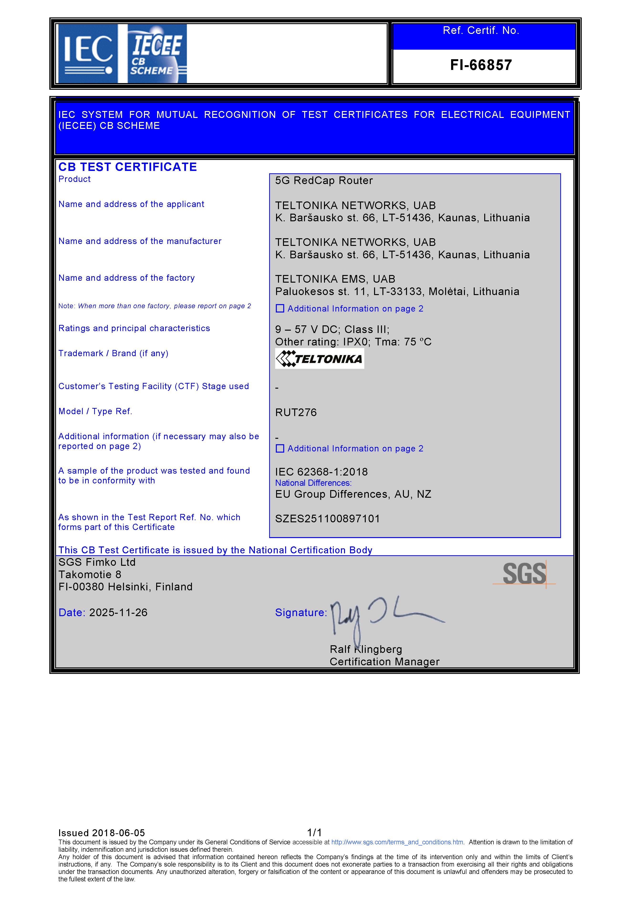 RUT276 was tested and certified in accordance with the IEC 62368-1:2018 Safety standard with EU group differences
