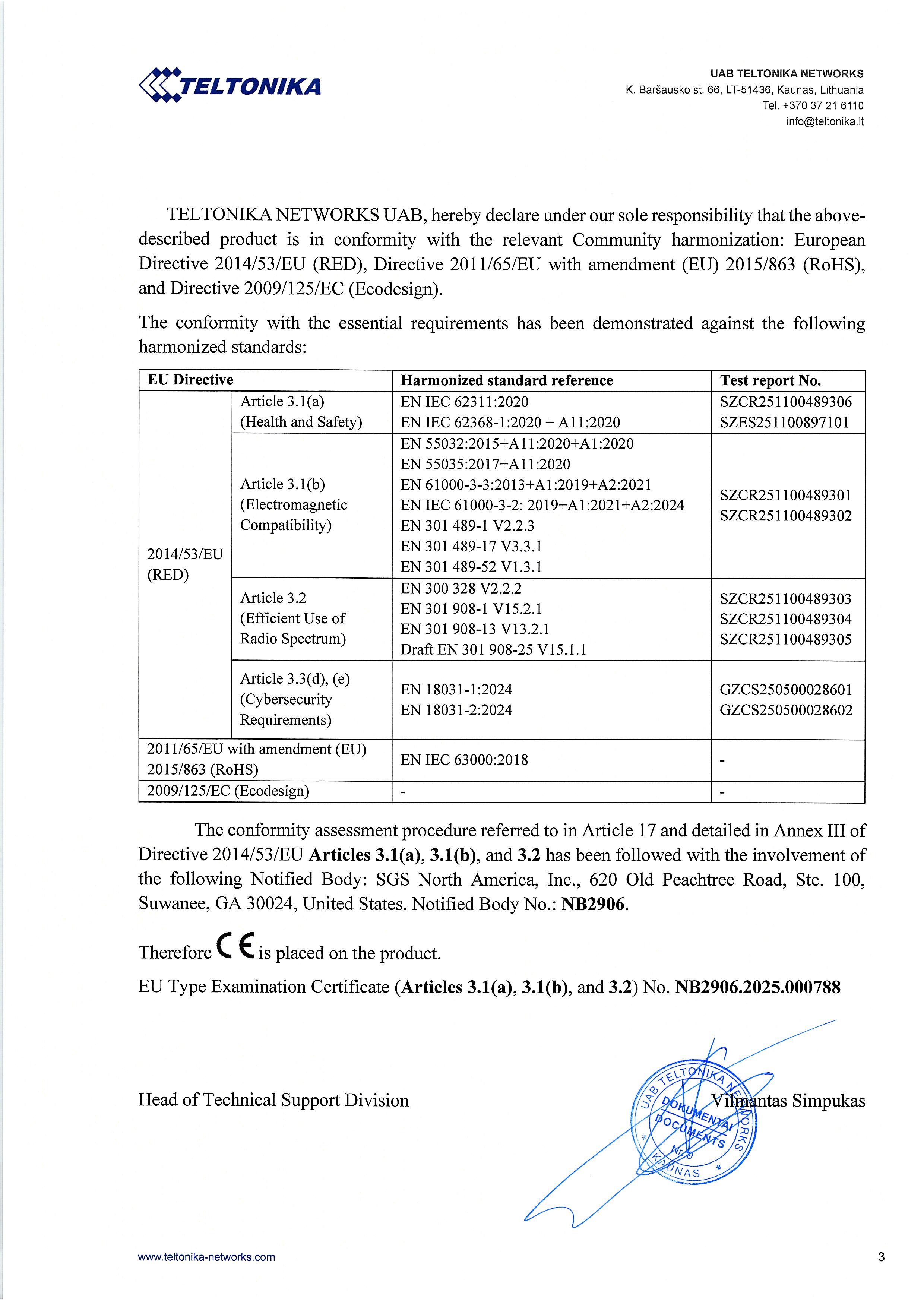 | EN 55032:2015+A11:2020+A1:2020 EN 61000-3-3:2013+A1:2019+A2:2021 EN IEC 61000-3-2: 2019+A1:2021+A2:2024 EN 55035:2017+A11:2020 EN 301 489-1 V2.2.3 EN 301 489-17 V3.3.1 EN 301 489-52 V1.3.1 |
