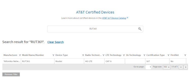 Devices under the product codes RUT361 2*****1 are certified for use in the AT&T network and can be found on the AT&T website among certified devices: