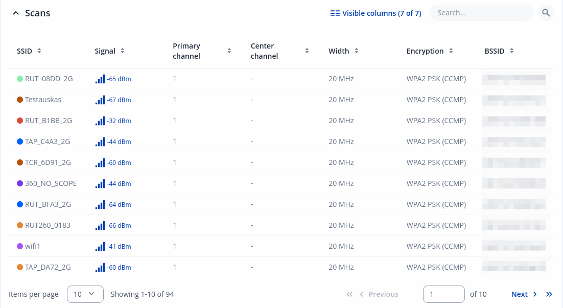 The Scans section shows visible wireless networks table. Table can be sort by SSID, signal strength, channel, width, encryption and MAC address. Example below: