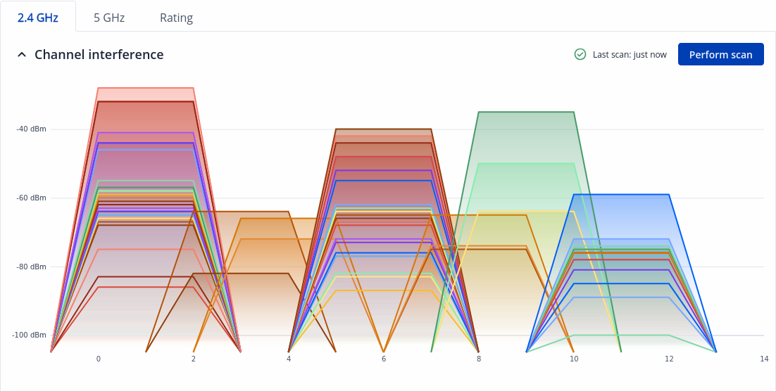 The Channel Interference section shows interactive diagram of channels interference radio bands that displays real-time allocation of channels in the environment. To start the channel interference scan - press `Perform scan` button.