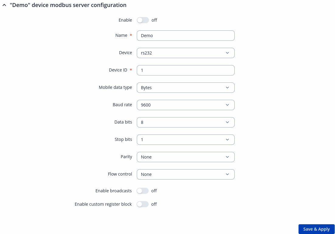| Enable | off | on; default: off | Enables this Modbus Serial Server instance configuration. |