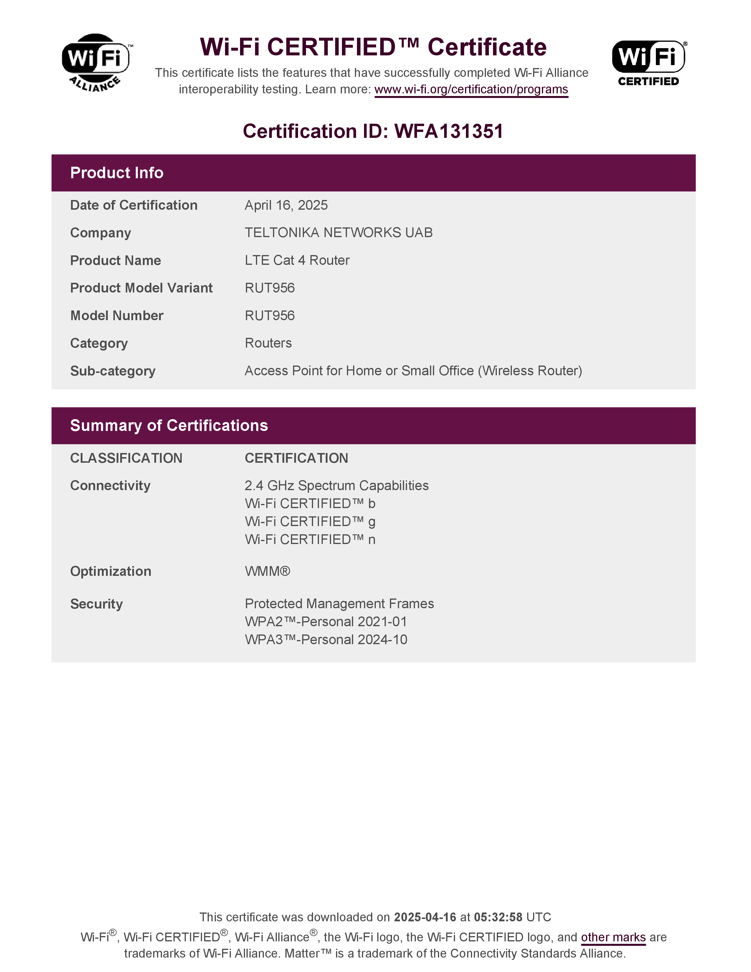 | RUT956 Certification ID: | WFA131351 |