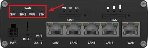 The WAN type LEDs are located at the top-right of the front panel.