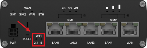 The WiFi band LEDs are located at the bottom of the front panel of the device, to the left of the Ethernet ports.