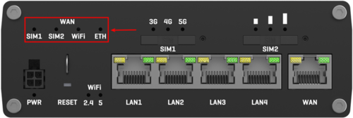 The WAN type LEDs are located at the top-right of the front panel.