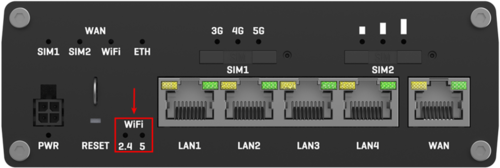 The WiFi band LEDs are located at the bottom of the front panel of the device, to the left of the Ethernet ports.