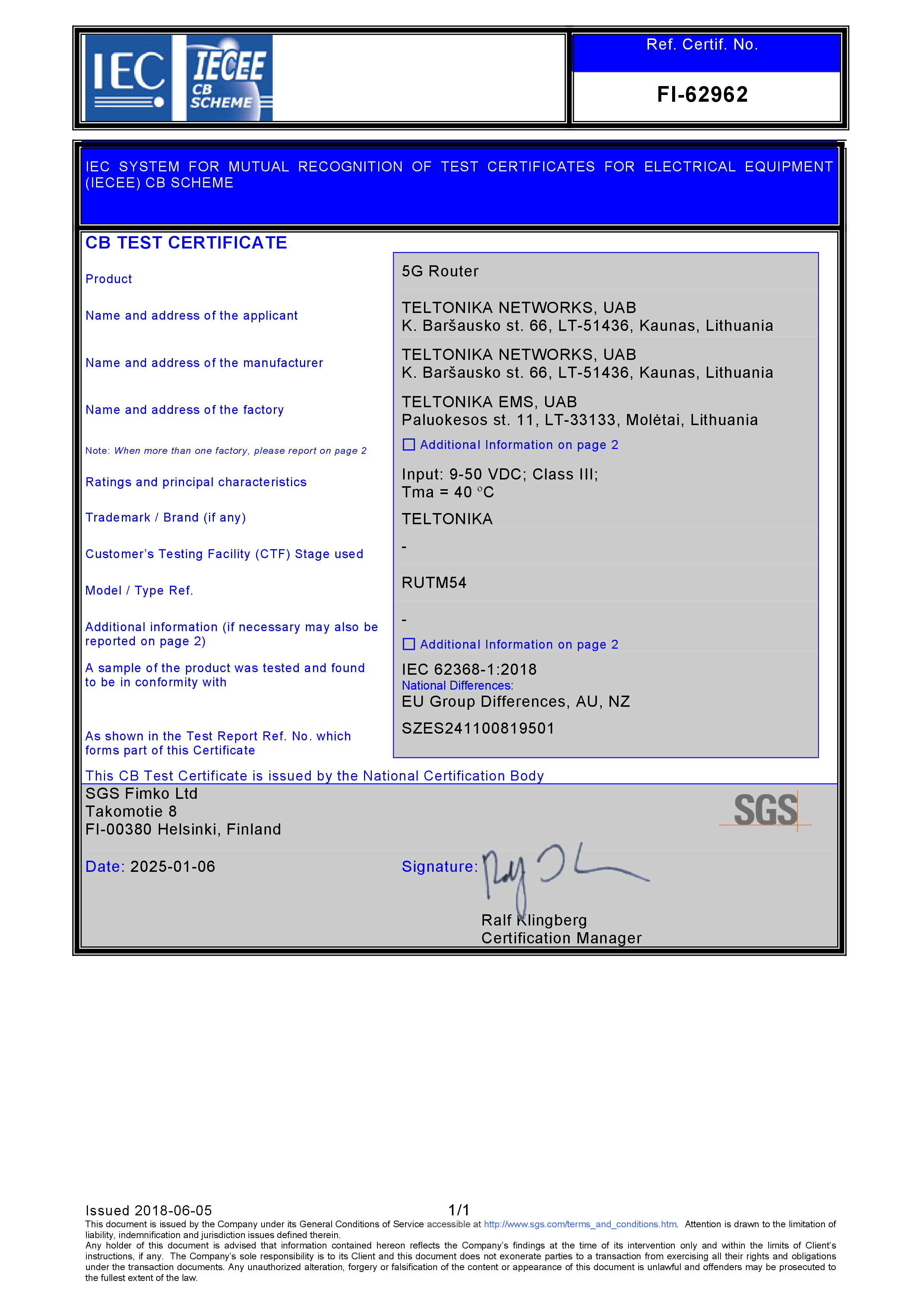| RUTM54 Reference Certification No. | FI-62962 |