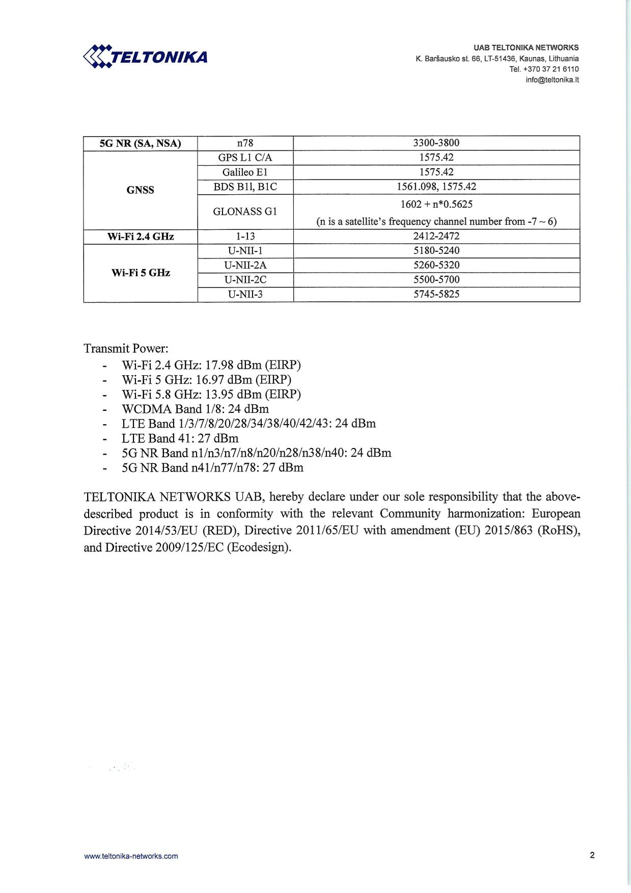 | EN 300 328 V2.2.2 EN 303 413 V1.2.1 EN 300 440 V2.2.1 EN 301 893 V2.1.1 EN 301 908-1 V15.2.1 EN 301 908-2 V13.1.1 EN 301 908-13 V13.2.1 Draft EN 301 908-25 V15.1.1_0.0.21 |