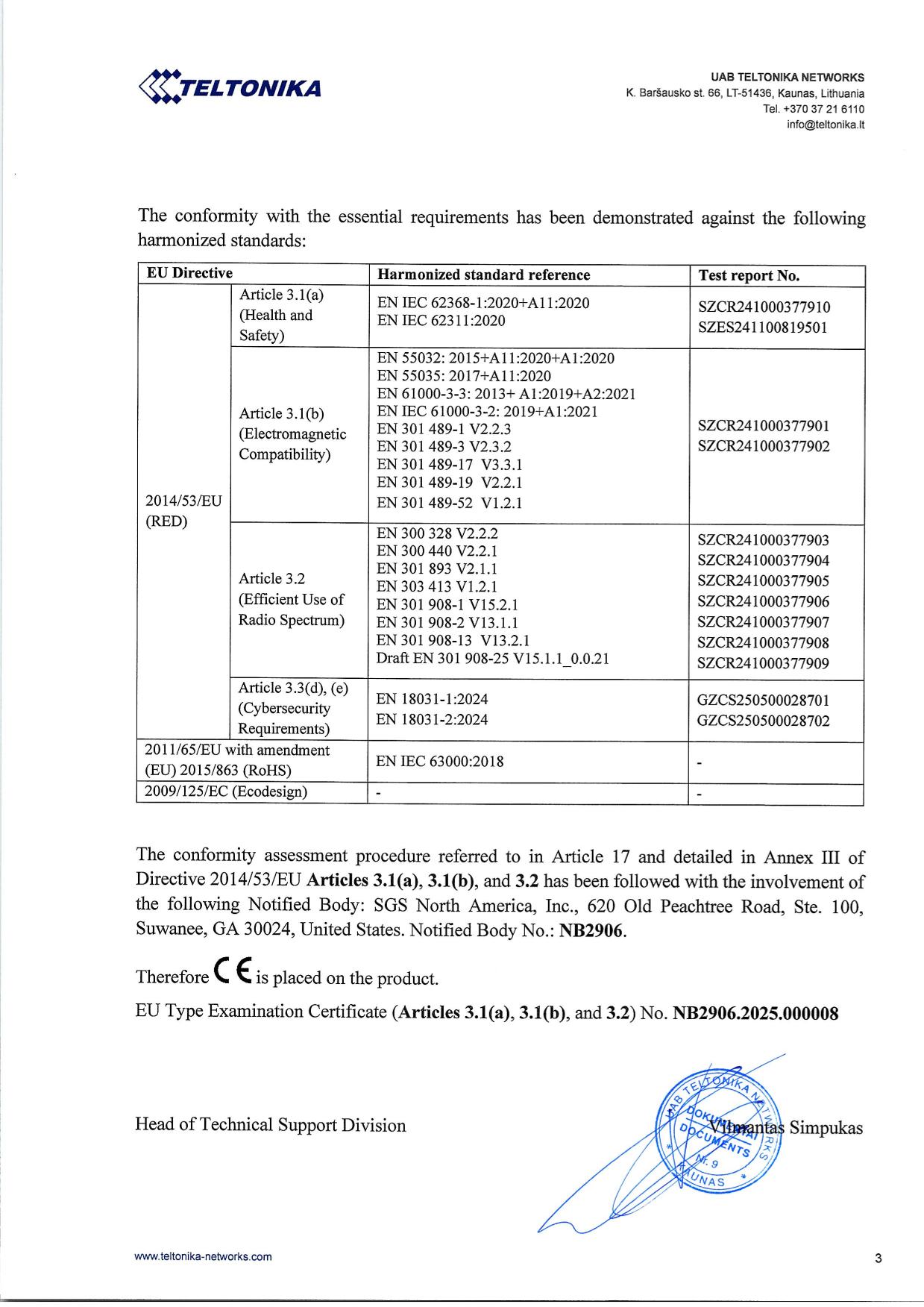 EU Type Examination Certificate (Articles 3.1(a), 3.1(b), and 3.2) No.: NB2906.2025.000008