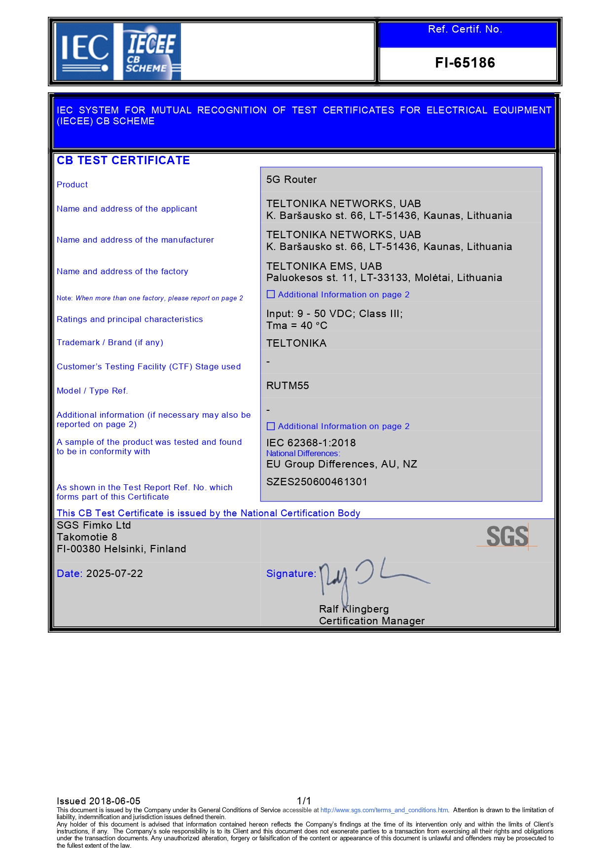 RUTM55 was tested and certified in accordance with the IEC 62368-1:2018 Safety standard with EU group differences