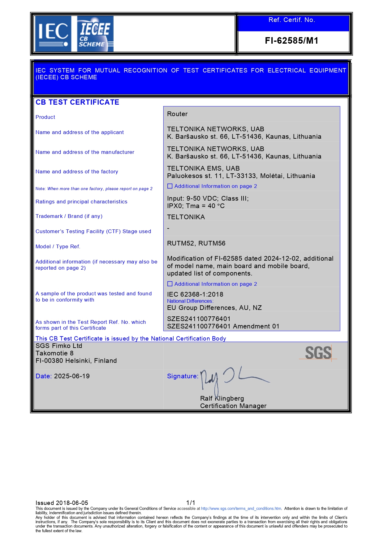 | RUTM56 Reference Certification No. | FI-62585/M1 |